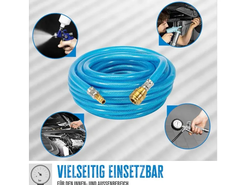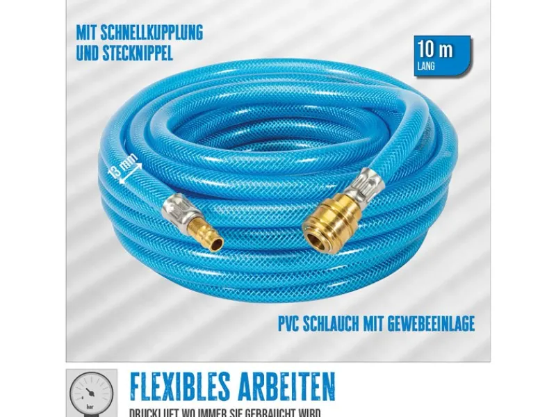 Das Güde Druckluftschlauch verfügt über eine Schnellkupplung und einen Stecknippel. Der PVC-Schlauch ist mit einer Gewebeeinlage ausgestattet. Die Nutzungsmöglichkeit des Produkts liegt bei bis zu -10 °C. Das Produkt ist ölbeständig und der maximale Platzdruck liegt bei 60 bar, der maximale Betriebsdruck bei 20 bar.