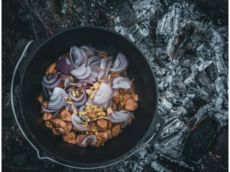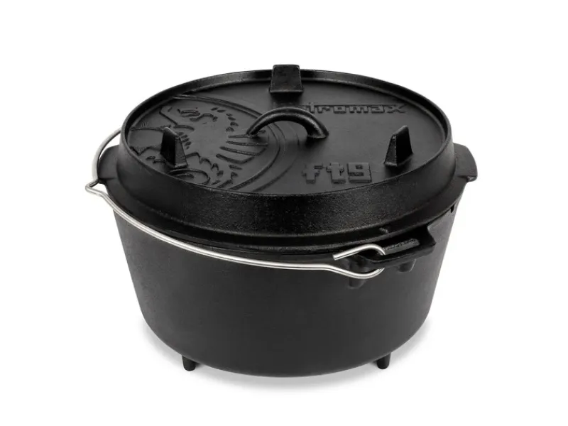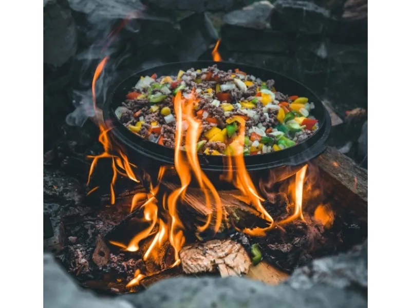 Du kannst den Bräter auf offenem Feuer, auf der Glut, dem Grill, im Atago, im Backofen oder auf einem normalen Herd nutzen. Im offenen Feuer ist der Topf am besten von Kohle umhüllt. Mithilfe der kleinen Standfüße kannst du den Schmortopf direkt ins Feuer oder in die Glut stellen. Der Dutch Oven kann aber auch direkt in das Feuer oder die Glut gestellt oder an ein Dreibein über die Feuerstelle gehängt werden. Der Deckel lässt sich als Pfanne nutzen und verfügt über einen hohen Rand, damit Kohle oder Briketts nicht herunterfallen.