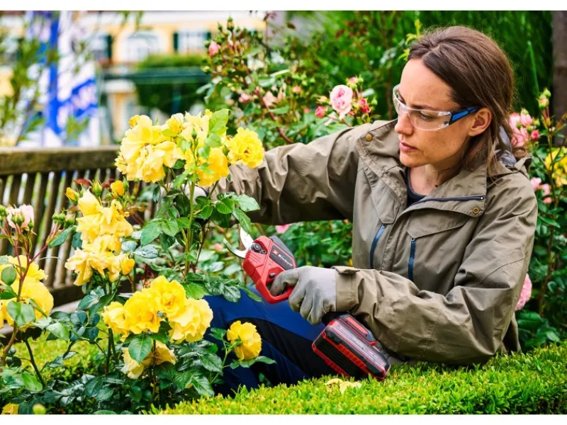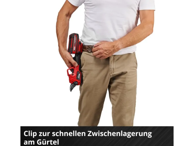 Zum sicheren Transport und für die optimale Aufbewahrung ist die Astschere mit einem Verriegelungsschalter für die Klingen ausgestattet und wird mit einer Kunststoffabdeckung geliefert. Per Gürtelclip lässt sich die Akku-Astschere zur schnellen Zwischenlagerung am Gürtel befestigen und dank kompakter Form mit ergonomischem Handgriff mit Softgrip liegt das handliche Gartengerät angenehm in der Hand.