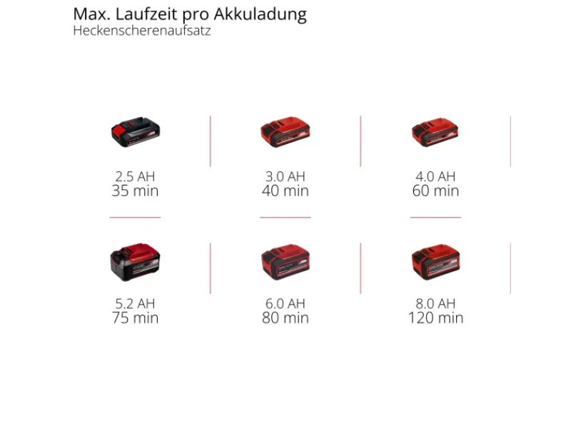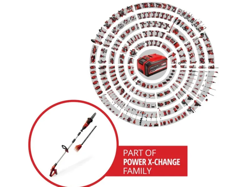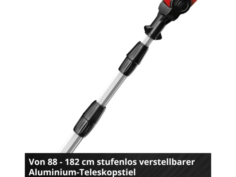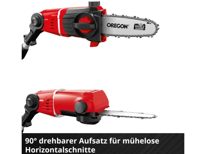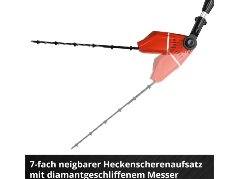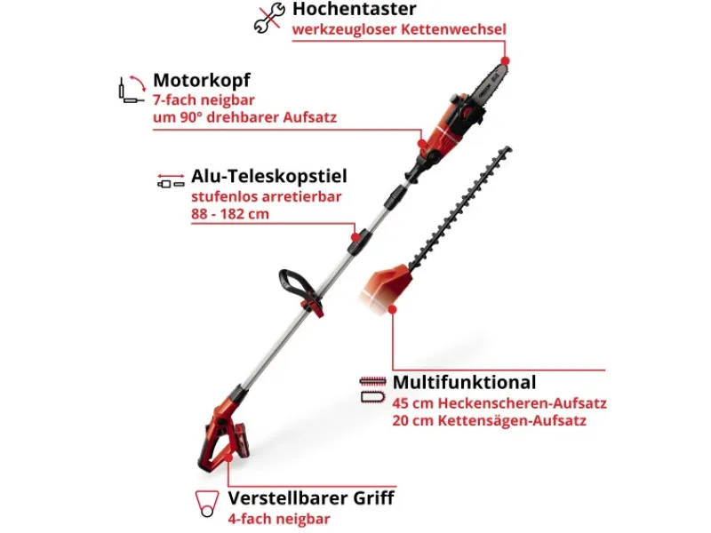 Der von 88 cm bis 184 cm stufenlos arretierbare Teleskopstiel lässt sich passgenau auf die gewünschte Arbeitshöhe einstellen. Der ebenfalls stufenlos verstellbare Zusatzhandgriff wird mit dem praktischen Schnellverschluss auf jeden Anwender angepasst. Um auch schwierige Schnitte in der Höhe sauber und präzise ausführen zu können, lassen sich der Motorkopf 7-fach und der Hauptgriff 4-fach neigen und somit auf jede Arbeitssituation abstimmen. Der Kettensägen-Aufsatz verfügt dabei über eine Schnittlänge von 17 cm und der Aufsatz der Heckenschere über eine Schnittlänge von 40 cm. Danke seines geringen Gewichts von gerade einmal 7 kg liegt der Akku Hochentaster zu jedem Zeitpunkt ausgezeichnet in der Hand und sorgt für eine ermüdungsfreie Anwendung.