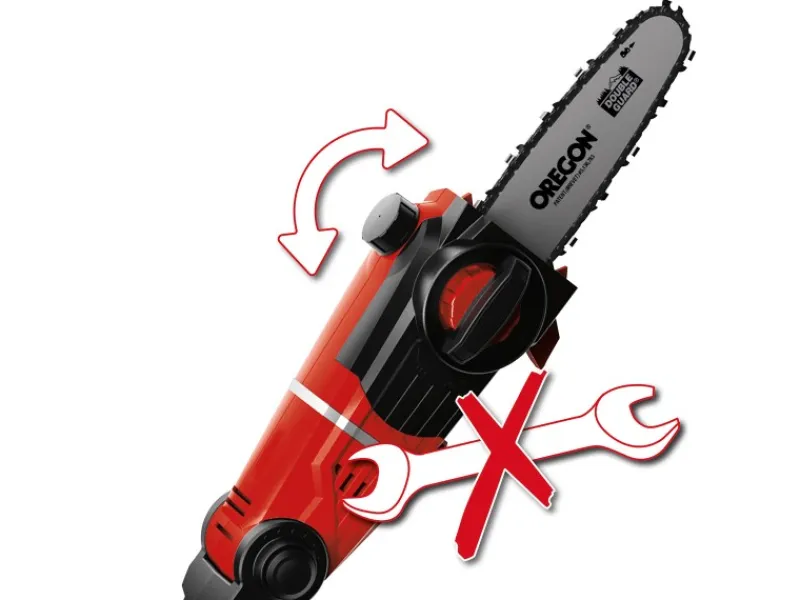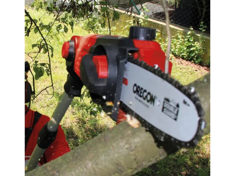 Mit dem Kettensägen-Aufsatz lassen sich höher gelegene, stärkere Äste bequem vom Boden aus durchtrennen. Das Oregon-Qualitätsschwert und die Oregon-Kette erzielen dabei saubere und effiziente Schnitte. Der Krallenanschlag hilft beim Ansetzen der Säge. Mit der werkzeuglosen Kettenspannung kann die Kette schnell und einfach gespannt oder gewechselt werden. Sollte die Kette einmal vom Schwert rutschen, fängt ein Kettenfangbolzen die Kette auf und verhindert so Verletzungen. Dank der automatischen Kettenschmierung durch einen Ölbehälter wird die Kette vor dem Vertrocknen geschützt.