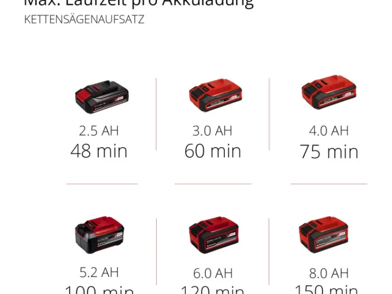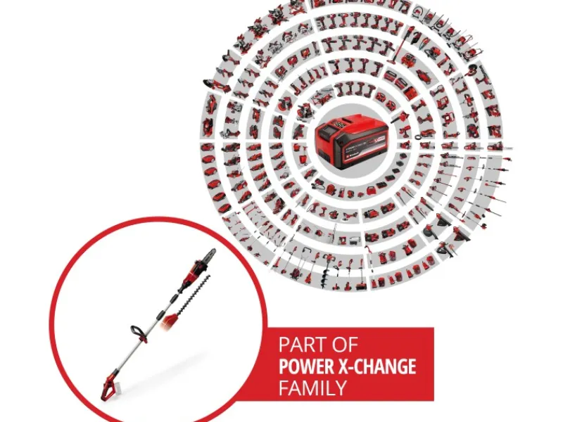 Der Akku-Hochentaster ist Mitglied der Einhell Power X-Change-Familie und wird mit einem 18 V Lithium-Ionen-Akku der Plattform betrieben. Diesen Akku kannst du für alle anderen Einhell Gartengeräte und Werkzeuge der Akkuplattform nutzen. Der Kauf mehrerer Akkus derselben Leistung wird dir erspart, was zu mehr Ordnung im Keller oder Geräteschuppen führt. Die Akkus der Power X-Change Familie verfügen über eine praktische Füllstandsanzeige mit 3 LEDs, die dir eine vorausschauende Arbeitsweise ermöglicht.