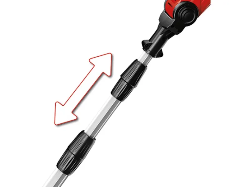 Der Teleskopstiel ist stufenlos um 94 cm erweiterbar und erreicht eine maximale Länge von 1,82 m. Der Hauptgriff ist in vier Stufen neigbar, sodass eine sichere Geräteführung aus verschiedenen Winkeln möglich ist. Der Zusatzhandgriff verleiht zusätzlichen Halt und ist ebenfalls stufenlos verstellbar und wird über einen Schnellverschluss arretiert. Der praktische Umhängegurt ist verstellbar und entlastet die Schulter. Für einen sicheren Transport und eine ordentliche Lagerung ist ein stabiler Köcher enthalten.