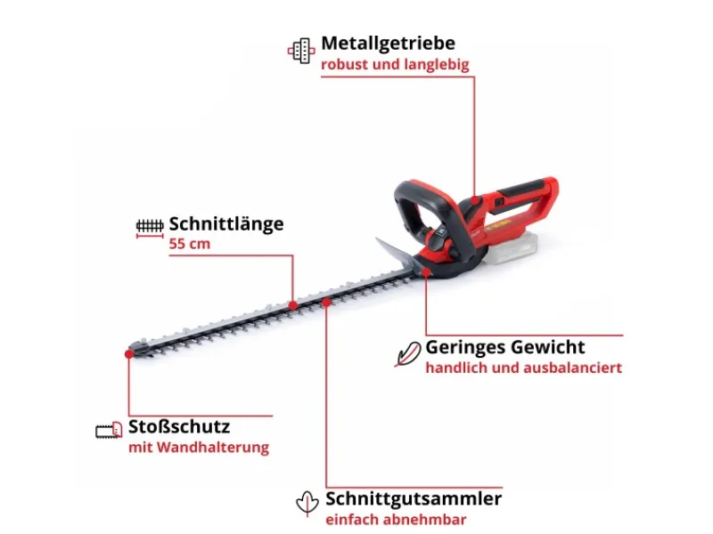 Die lasergeschnittenen und diamantgeschliffenen Messer aus Stahl sind besonders langlebig und liefern saubere Schnittergebnisse. Mit einer Schnittlänge von 55 cm und einer Schnittleistung von 2.200 Schnitten pro Minute bearbeiten Sie auch größere Hecken mühelos. Dank des Zahnabstands von 18 mm lassen sich dickere Äste problemlos durchtrennen. Das robuste Metallgetriebe sorgt für eine lange Lebensdauer. Der Schnittgutsammler dient zum praktischen Abkehren der Heckenoberseite, sodass das lästige Absammeln des Schnittguts wegfällt.