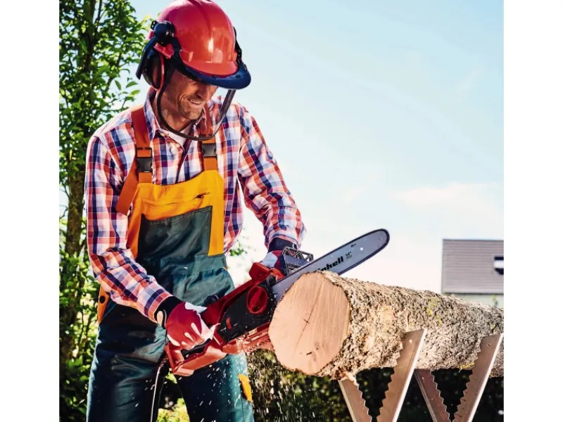 Sollte die Kette durch eine Blockade oder ähnliches hochschlagen sorgt ein Rückschlagschutz mit mechanischer Sofort-Bremse für einen unmittelbaren Stillstand der Kette, sodass Verletzungen vermieden werden. Der Kettenfangbolzen trägt ebenfalls zu einer sicheren Verwendung bei und fängt die Kette sicher auf, falls diese einmal vom Schwert springen sollte. Darüber hinaus schützt die Kabelzugentlastung das Kabel vor Beschädigungen. Der ergonomische Handgriff bietet einen angenehmen Halt.
