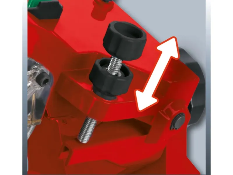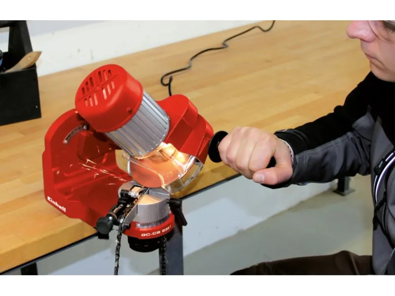 Das Einhell Sägekettenschärfgerät GC-CS 235 E ist ein kompakter, robuster und zuverlässiger Helfer zum präzisen Schärfen aller gängigen Sägeketten. Durch die drehbare und mit einer Skala zur präzisen Schleifwinkeleinstellung ausgestatte Spannvorrichtung können alle Schneidglieder der Sägekette geschärft werden, ohne diese umzuspannen. Die Verstellungsmöglichkeit der Dachwinkeleinstellung erweitert den Anwendungsbereich der Maschine. Eine Tiefenbegrenzung schützt die Kette vor zu viel Materialabnahme. Das transparente Sichtglas ermöglicht zusammen mit der Beleuchtung genaues und sicheres Arbeiten auch bei wenig Tageslicht.