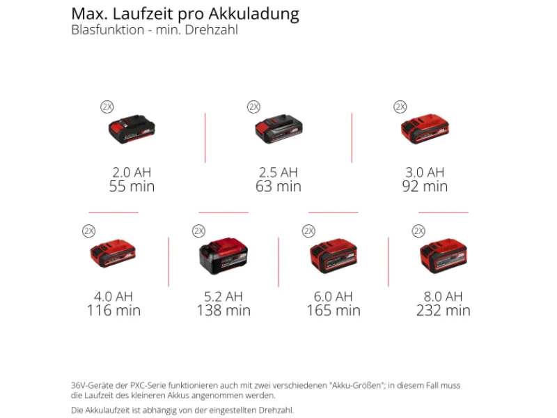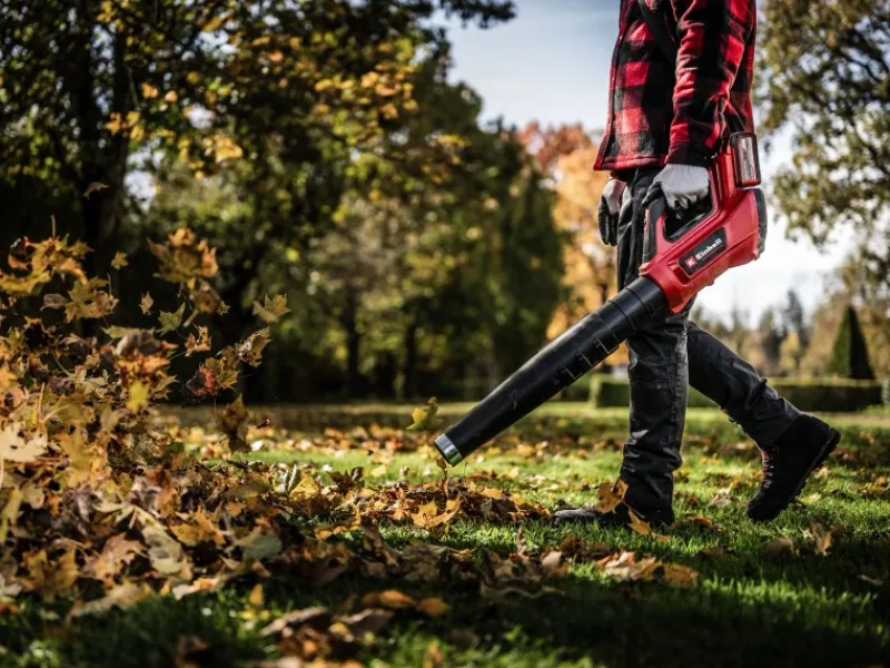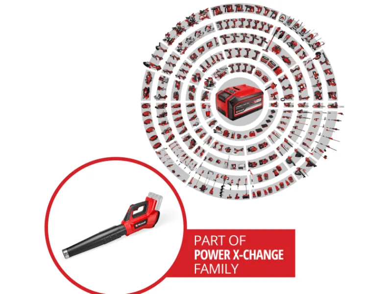 Angetrieben wird das Gerät von einem Einhell Brushless Motor. Dieser bürstenlose Motor bietet mehr Kraft und eine längere Laufzeit als herkömmliche Kohlebürsten-Motoren. Per Drehzahlregulierung und zusätzlichem Turboschalter lässt sich die Blasleistung präzise für jeden Einsatzzweck dosieren. Dabei schafft der Laubbläser bis zu 890 m³/h Blasleistung und 230 km/h Luftgeschwindigkeit.