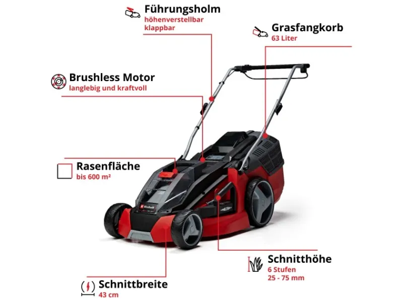 Dank der praktischen Schnitthöhenverstellung lässt sich die Graslänge in sechs Stufen von 25 mm bis 75 mm individuell auf das gewünschte Ergebnis einstellen. Die hochwertigen Messer haben eine Schnittbreite von 43 cm und sorgen für einen präzisen und pflanzenschonenden Grünschnitt. Mit einem bürstenlosen Motor arbeitet der Akku-Mäher dabei äußerst effizient und leistungsstark ohne Verschleiß.