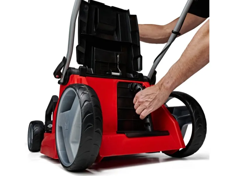 Als Highwheeler verfügt der Rasenmäher über erhöhte Hinterräder, die das Schieben in anspruchsvollem Gelände erleichtern. Der klappbare Führungsholm ermöglicht eine platzsparende Lagerung und lässt sich in der Höhe individuell auf den Verwender einstellen. Der schlanke Griff ist mit einer Gummierung versehen und verfügt daher über eine hervorragende Haptik. Dank des praktischen Tragegriffs lässt sich der Rasenmäher zudem einfach transportieren. Für eine sichere Verwendung sorgt der zusätzliche Totmannschalter, der für das sofortige Ausschalten des Motors sorgt, sobald dieser losgelassen wird.