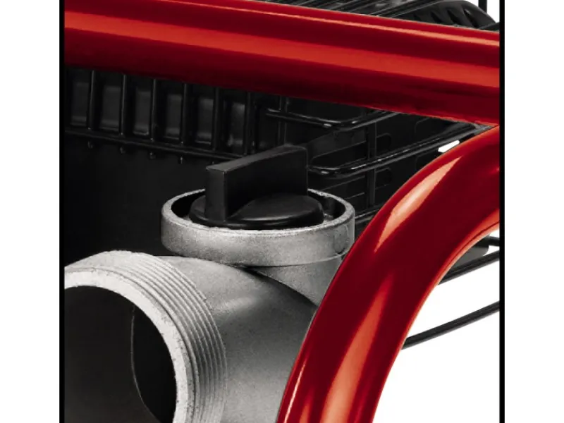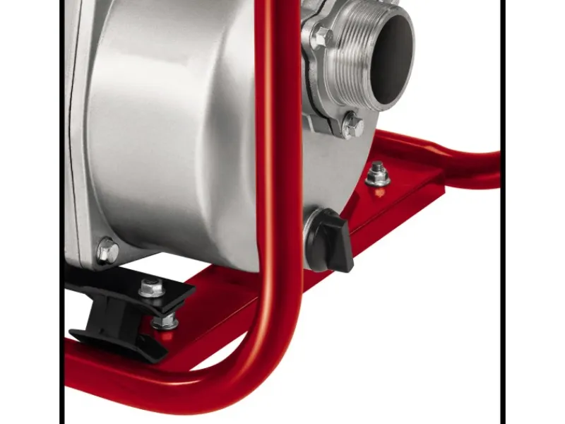Die Druckanschlüsse und der Sauganschluss sind mit einem 59,6 mm (2″) Außengewinde ausgestattet. Dank des stabilen Stahlrohr-Rahmens steht die GE-PW 46 fest und sicher. Die Pumpe verfügt über einen 4,2 l großen Tank, der längere Betriebsphasen ermöglicht. Für eine komfortable Befüllung der Pumpe ist eine Wassereinfüllschraube vorhanden, und nach dem Einsatz kann Restwasser mittels der Wasserentleerungsschraube abgelassen werden.