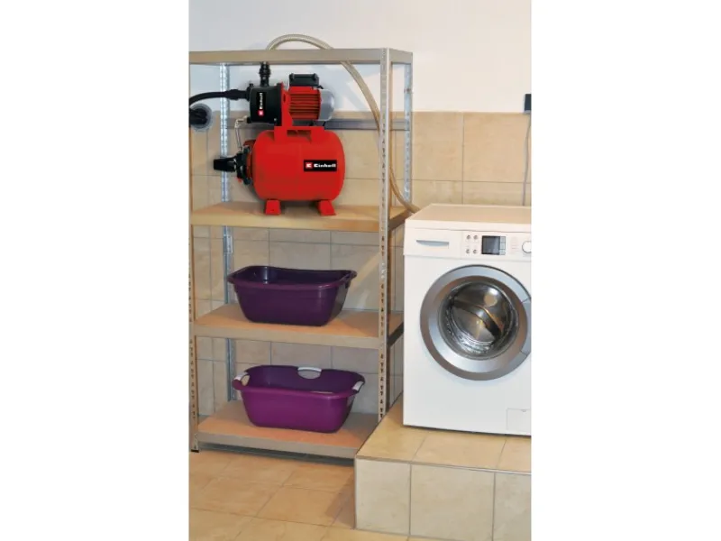 Der Druckkessel bietet ein Behältervolumen von 20 l, sodass die Pumpe nicht bei jeder Wasserentnahme anspringt. Erst beim Abfallen des Drucks wird die Pumpe durch den integrierten Druckschalter automatisch eingeschaltet und nach Erreichen des maximalen Drucks wieder deaktiviert. Mithilfe des Manometers lässt sich der Druck auf einen Blick ablesen.