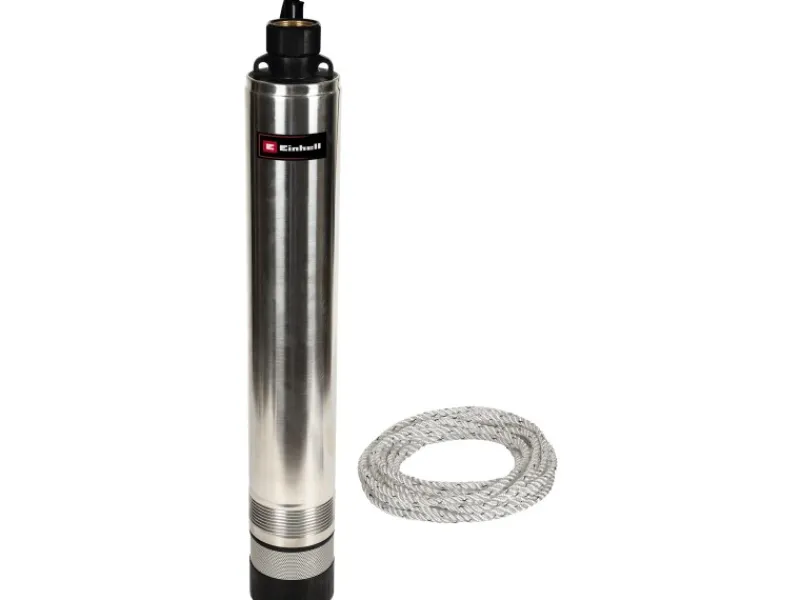 Die Einhell Tiefbrunnenpumpe GC-DW 1045 N ist eine robuste Basispumpe zur Förderung von Klarwasser für Gärten oder Brauchwasser im Haushalt und auch geeignet für den Aufbau einer Rasensprinkleranlage und großflächigen Gartenbewässerungssystemen. Die schlanke Tiefbrunnenpumpe ist für Brunnen, Reservoirs sowie Zisternen ideal geeignet. Bis zu 19 Meter in die Tiefe kann die Pumpe von Einhell mit dem mitgelieferten Seil abgelassen werden, an zwei Aufhängeösen kann sie fest und sicher fixiert werden. Mit dem starken 1000 Watt-Motor fördert die Tauchpumpe bis zu 6500 Liter Wasser pro Stunde. Ein mehrstufiges Pumpenrad liefert den gleichmäßigen Druck. Das integrierte Rückschlagventil verhindert das Zurückfließen beim Ausschalten. Die hochwertigen Materialien und die Einzelkomponenten aus rostfreiem Edelstahl gewähren eine lange Lebensdauer: Das Pumpengehäuse besteht aus rostfreiem Edelstahl und der robuste Druckanschluss ist mit einem Edelstahl-Einsatz ausgestattet. Auch das Schmutzsieb besteht aus Edelstahl. Die hochwertige Gleitringdichtung sorgt für eine lange Lebensdauer. Ein thermischer Überlastschutz schützt das Gerät bei einer Überlastung und schaltet in einem solchen Fall automatisch ab. Der Schlauchanschluss ist gut erreichbar an der Pumpenoberseite integriert.