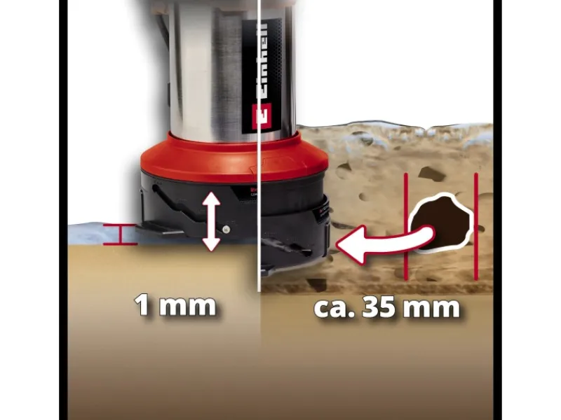 Der Trockenlaufschutz gewährleistet, dass der Motor nur arbeitet, wenn die Schmutzwasserpumpe im Wasser ist, und vermeidet dadurch Schäden am Gerät. Ein Pumpenstart ist bereits ab einer Wasserhöhe von 15 mm möglich. Durch eine einfache Drehbewegung kann die Absaugniveau-Regulierung in 4 Stufen schnell an die gewünschte Funktion angepasst werden. Die Pumpe kann zwei Aufgaben übernehmen: flachabsaugend bis zu einem Restwasserstand von 1 mm im Klarwasserbetrieb oder Absaugen von Schmutzwasser mit einer Korngröße von bis zu 35 mm.