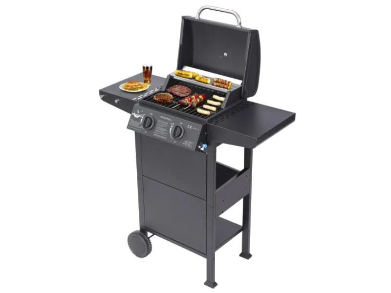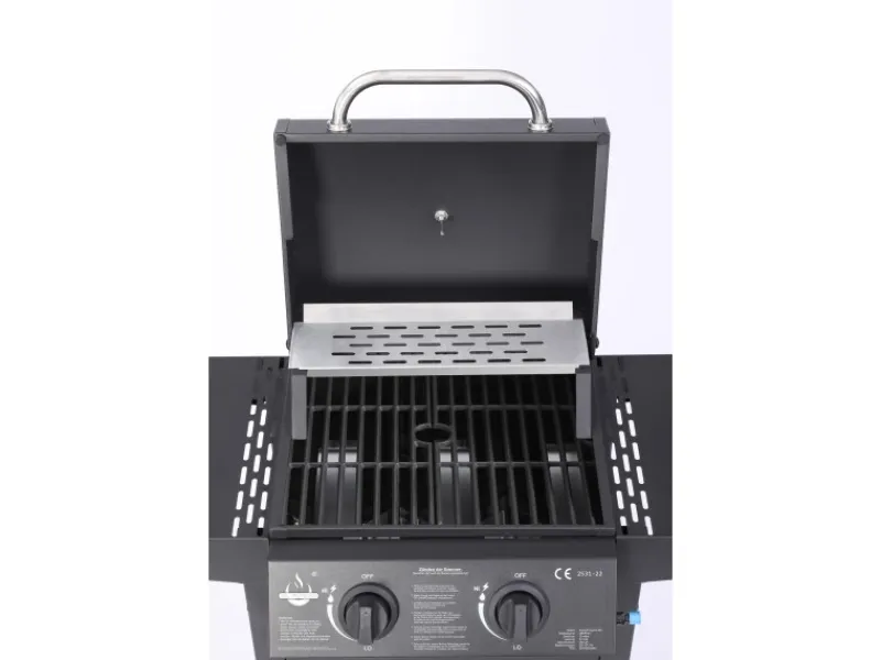 Der Grill verfügt über eine Nennleistung von 5,0 kW, die sich auf 2 Brenner mit jeweils 2,5 kW aufteilt. Die Brenner bestehen aus Edelstahl, und die Zündung erfolgt über einen Piezo-Zünder. Zu den Eigenschaften des Grills gehört ein Thermometer, das ein perfektes Grillergebnis ermöglicht, sowie großzügige Ablagemöglichkeiten. Der Grill wird inklusive Gasschlauch und Gasdruckminderer geliefert und besteht aus Stahlblech.