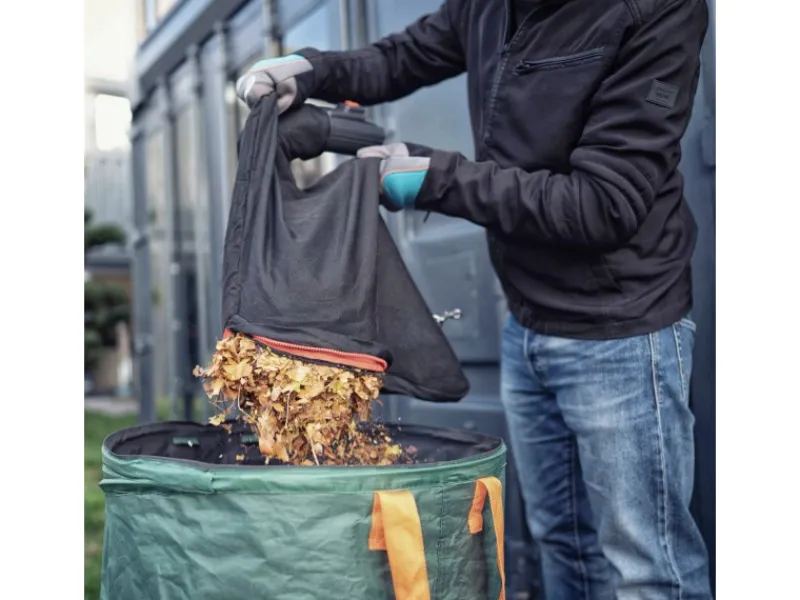 Die praktische Häckselfunktion zerkleinert das Laub mit Hilfe eines integrierten und besonders stabilen Turbinen-Häckselrads aus Metall. Der robuste Metallimpeller sorgt für eine bessere Kompostierung des Abfalls. Dank einer großzügigen Volumenreduzierung im Verhältnis von 16:1 und einem Fassungsvermögen von 45 l müssen Sie seltener zum Kompost laufen und den Fangsack entleeren.