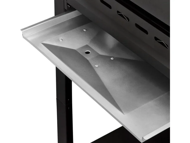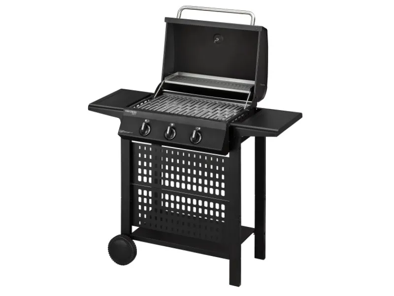 Der Grillwagen verfügt über eine Piezozündung im Bedienknopf. Dieser erzeugt einen Funken ohne offene Flamme und entzündet so die drei Edelstahlbrenner, die Sie für indirektes oder direktes Grillen nutzen können. Ein Warmhalterost aus Edelstahl schwingt beim Öffnen und Schließen der Haube mit. Der Edelstahl-Grillrost und die herausnehmbare Fettschublade lassen sich leicht reinigen.