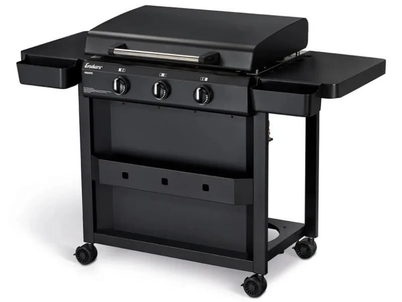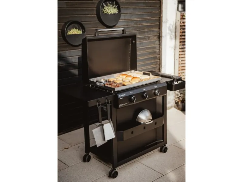 Die abnehmbare Haube schützt deine Plancha zwischen den Grillsessions nicht nur vor Wind und Wetter, sondern lässt sich auch ganz ohne Werkzeug mühelos abnehmen – flachmatt gesetzt. Mit den abklappbaren Seitentischen und praktischen Haken, an denen du Körbe für Gewürze oder Grillbesteck aufhängen kannst, hast du alles, was du brauchst, direkt zur Hand. Und das großzügige Ablagefach im Frontbereich bietet noch mehr Platz für große Flaschen oder deine liebsten Saucen.