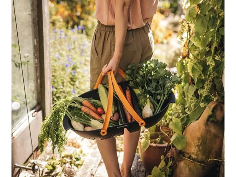 An der Seite befinden sich ergonomisch geformte Griffe, die das Tragen mit beiden Händen ermöglichen. So kannst du auch größeres Obst oder Gemüse sicher vom Gemüsegarten in die Küche bringen. Die Klappgriffe dienen zum einhändigen Tragen des Erntekorbs und greifen für eine angenehme Handhabung oben ineinander.