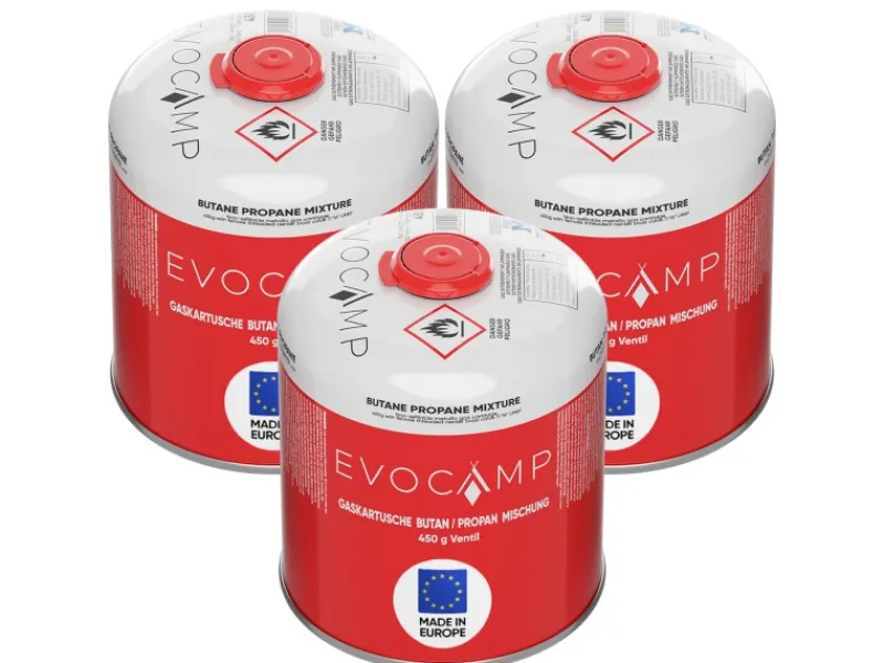 Die EVOCAMP Propan-Butan-Gaskartuschen mit 450 g Inhalt sind vielseitig einsetzbar. Sie passen für alle gängigen Campingkocher, Gasgrills, Abflammgeräte, Lötlampen und Heizgeräte mit 7/16″ Euroanschluss (EN 417).