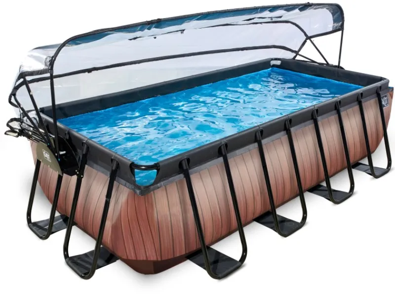 Der EXIT Wood Pool 400 x 200 x 100 cm ist ein rechteckiger Rahmenpool mit Abdeckung. Der Pool mit Holzlook ist standardmäßig mit einer Sandfilterpumpe und einer Poolleiter ausgestattet, mit der Sie sicher in- und aus dem Pool steigen können. Der Wood Pool hat ein modernes und starkes Holzmuster auf der Seitenwand und ist damit ein echter Blickfänger im Garten. Der EXIT Pool ist mit starken 3-lagigen Wänden aus PVC und Polyester versehen. Die hochwertige Sandfilterpumpe reinigt kleinste Partikel aus dem Pool, indem sie das Wasser durch ein Filterbett pumpt. Das sorgt dafür, dass Dreck, wie Sand, Ungeziefer oder Algen im Filter landen. Mit der EXIT Abdeckung für Pools sind Sie nicht länger abhängig von den Wettervorhersagen. Die Abdeckung sorgt dafür, dass kein Schmutz mehr in das Wasser kommen kann und ist gleichzeitig eine praktische Lösung, um die Wärme der Sonne zu nutzen, da die Wärme unter der Haube festgehalten wird. Die Abdeckung ist durchsichtig und sehr einfach durch integrierte Gasdruckfeder zu öffnen. Die Abdeckung hat auch vier auffaltbare Fenster. Der stählerne schwarze Rahmen des Pools ist extra dick mit einem Durchmesser von 50 mm und die Rahmenbeine sorgen für optimale Stabilität, sodass der Pool immer fest stehen bleibt. Natürlich ist auch an Langlebigkeit gedacht: der schwarze Rahmen ist galvanisiert und pulverbeschichtet, damit Rost keine Chance hat.