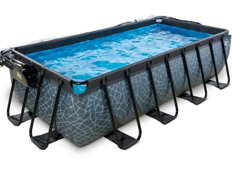 Der EXIT Stone Pool 400 x 200 x 100 cm ist ein rechteckiger grauer Rahmenpool mit Abdeckung. Der Pool ist standardmäßig mit einer Sandfilterpumpe, Wärmepumpe und einer Poolleiter ausgestattet, mit der Sie sicher in- und aus dem Pool steigen können. Der Stone Pool hat ein modernes und starkes Steinmuster auf der Seitenwand und ist damit ein echter Blickfänger im Garten. Der EXIT Pool ist mit starken 3-lagigen Wänden aus PVC und Polyester versehen und das Innere des Pools ist blau für das frische Schwimmbadgefühl. Mit der EXIT Abdeckung für Pools sind Sie nicht länger abhängig von den Wettervorhersagen. Die Abdeckung sorgt dafür, dass kein Schmutz mehr in das Wasser kommen kann und hält die Wärme der Sonne unter der Haube fest. Die Abdeckung ist durchsichtig und sehr einfach durch integrierte Gasdruckfeder zu öffnen. Die Abdeckung hat auch vier auffaltbare Fenster. Im Lieferumfang des EXIT Stone Pools ist verschiedenes Zubehör enthalten. So reinigt die Sandfilterpumpe kleinste Partikel aus dem Pool, indem sie das Wasser durch ein Filterbett pumpt. Das sorgt dafür, dass Dreck, wie Sand, Ungeziefer oder Algen im Filter landen. Die Wärmepumpe wird an die Sandfilterpumpe angeschlossen und kann das Wasser auf gut und gerne 40 Grad erwärmen. Der stählerne schwarze Rahmen des Pools ist extra dick mit einem Durchmesser von 50 mm und die Rahmenbeine sorgen für optimale Stabilität, sodass der Pool immer fest stehen bleibt. Natürlich ist auch an Langlebigkeit gedacht: der schwarze Rahmen ist galvanisiert und pulverbeschichtet, damit Rost keine Chance hat.