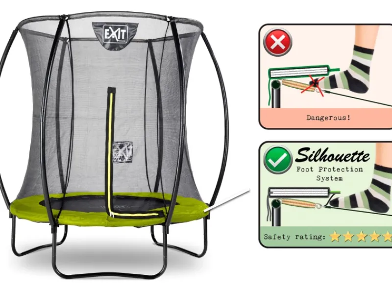 Das EXIT Silhouette Trampolin auf Füßen ist ein rundes Trampolin von guter Qualität. Das Sicherheitsnetz, dass standartmäßig zu dem Trampolin auf Füßen mitgeliefert wird, ist mit gebogenen Pfosten ausgestattet sodass das Netz straff gespannt ist. Der hochwertige Schutzrand bedeckt die galvanisierten Federn völlig und ist mit einem speziell entwickelten Fußschutzsystem versehen, sodass dein Fuß nicht zwischen die Federn kommen kann. Die kräftigen Federn stehen Garant für gute Sprungkraft. Der Rahmen des Silhouette Trampolins ist galvanisiert und pulverbeschichtet sodass Rost keine Chance hat. Erlebe endlos viel Springspaß auf den EXIT Silhouette Trampolinen!