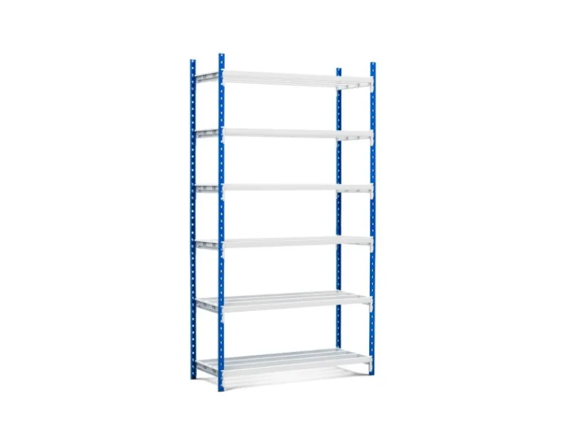 Die Fachböden sind wahlweise ohne Auflage oder mit Spanplatten, Metallplatten oder PVC-Platten erhältlich. Sie lassen sich flexibel in einem Raster von 5 cm in der Höhe verstellen, sodass das Regal individuell angepasst werden kann.