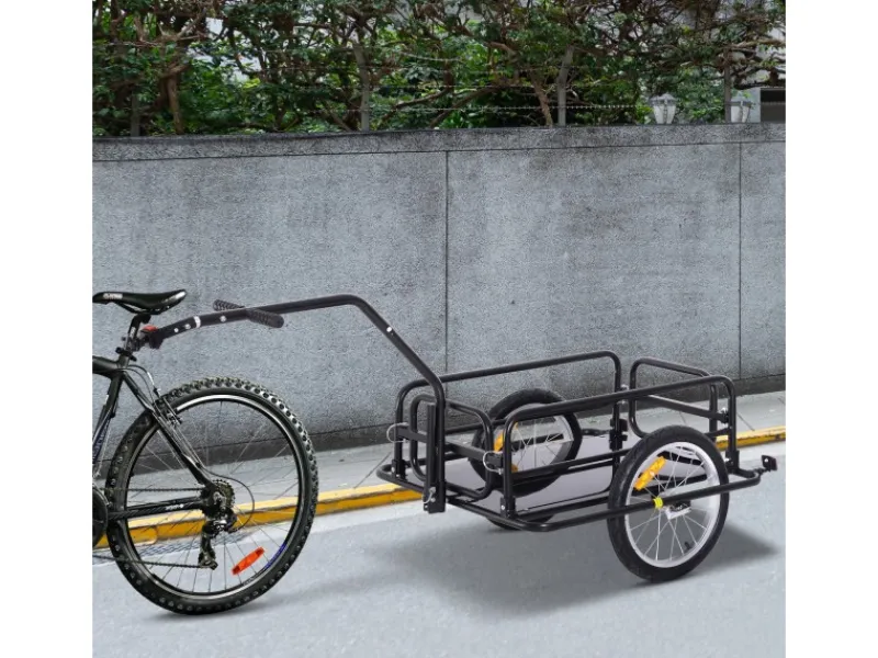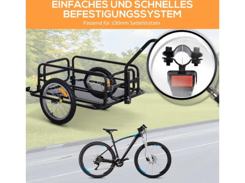 Mit dem Fahrrad lässt sich sehr wohl viel transportieren. Mit dem Lastenanhänger von HOMCOM sogar sehr einfach. Die Universal-Anhängerkupplung passt an fast jedes Fahrrad und ist schnell an- und wieder abmontiert. Der robuste Stahlrahmen lässt eine Beladung von bis zu 36 kg zu. Mit den 16-Zoll-Reifen ist sich der Anhänger auch vollbeladen noch leicht zu ziehen und die Felgenreflektoren sorgen für eine bessere Sichtbarkeit.