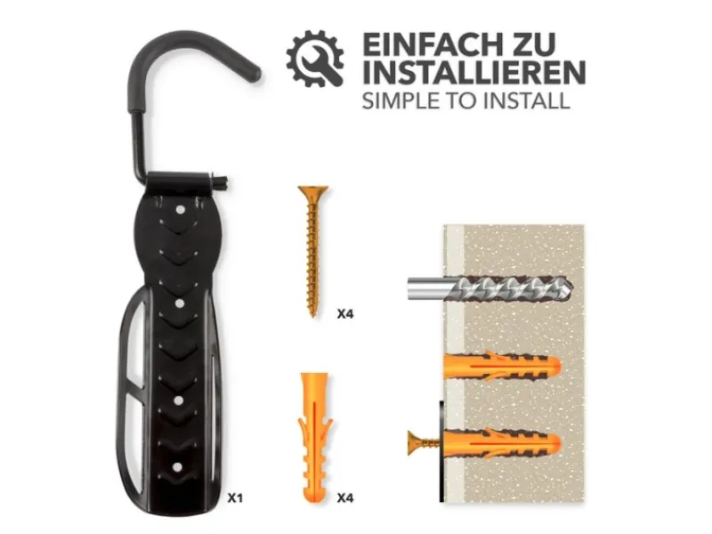 Zügig an der Wand montiert, müssen Sie nie wieder einen Gedanken an unnötiges Herumstehen mitten im Weg oder lästige Stolperfallen verschwenden. Auch wenn Sie Ihr Rad einmal längere Zeit nicht benutzen wollen – „Eddy“ präsentiert es stets aufgeräumt an der Wand. Beim Aufhängen des Rads sorgt ein integrierter Haltebügel für den nötigen Schutz vor unbeabsichtigten Beschädigungen der Felge.