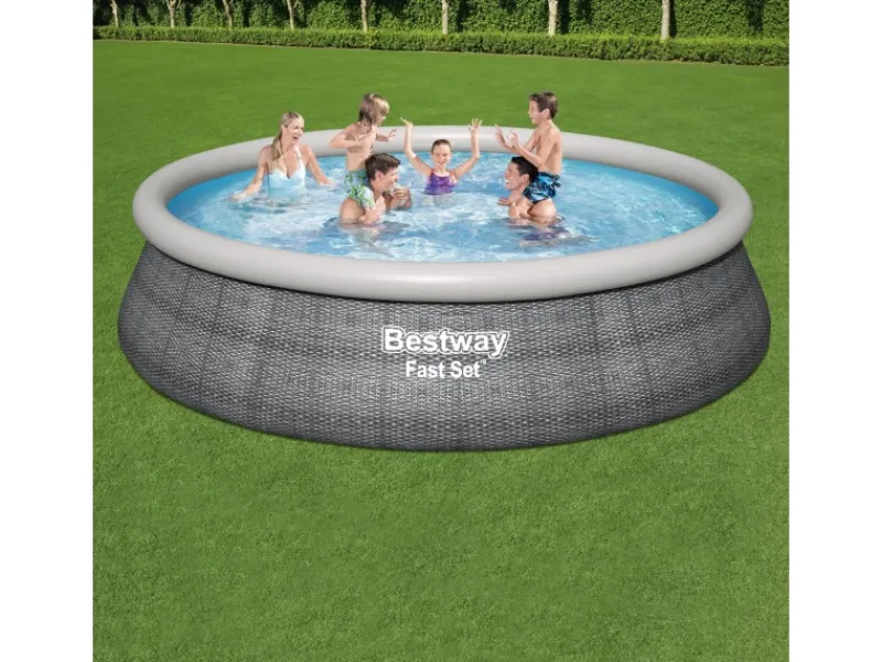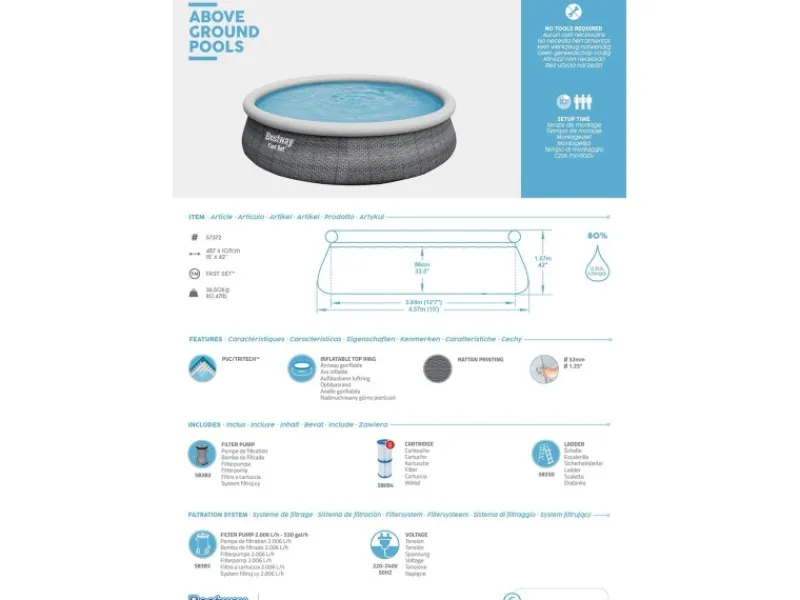 Als Quick-Up Pool lässt er sich schnell und leicht ohne jegliche Werkzeuge aufbauen. Sobald Sie die Luft in den oberen aufblasbaren Ring leiten, baut sich das Becken in Windeseile von selbst auf.