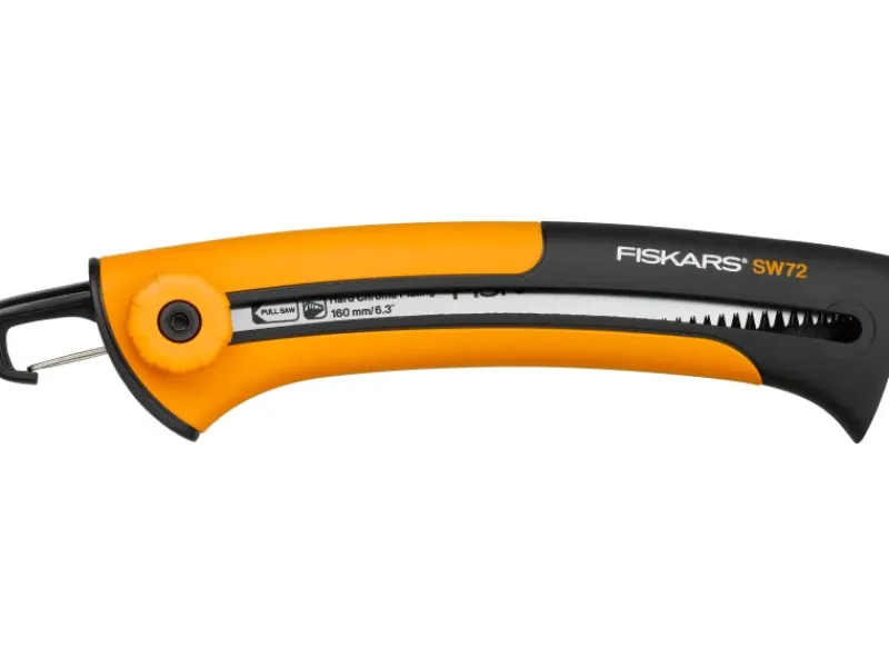 Der rutschfeste Griff weist neben dem Fingerschutz einen integrierten Clip auf, mit dem die Säge an einem Gürtel befestigt werden kann.