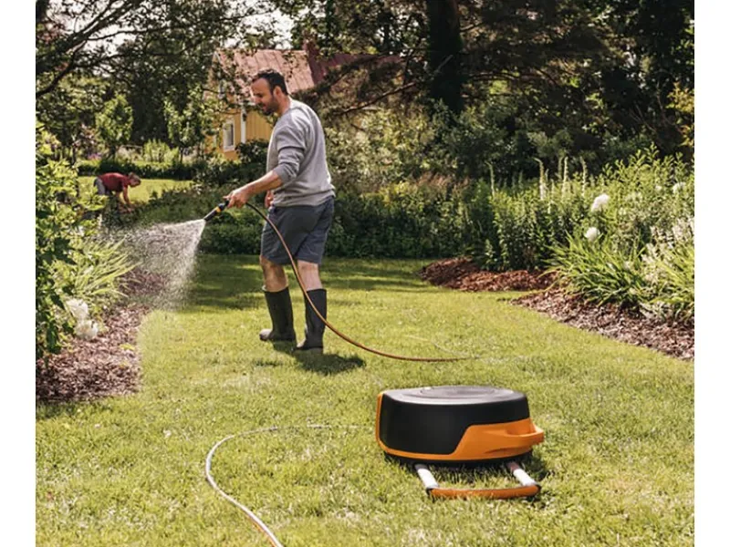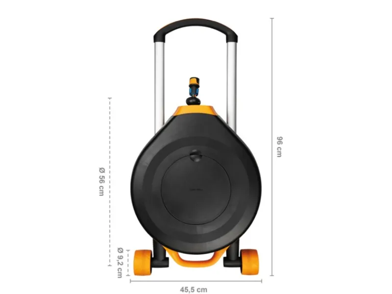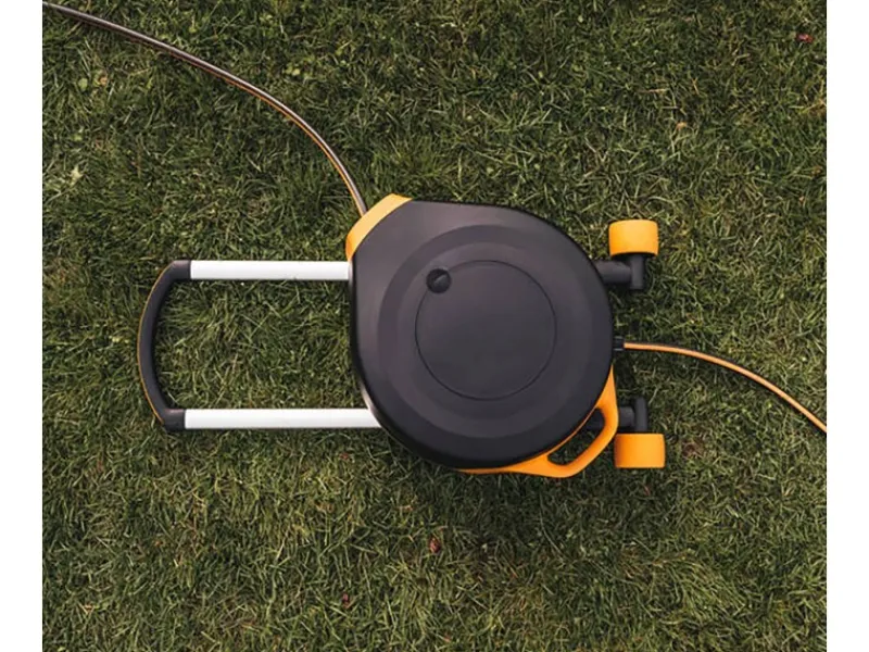 Mit einem Zulaufschlauch von 7 m lässt sich die Schlauchtrommel gut im Garten positionieren. Der 20 m Auslassschlauch bietet bereits eine komfortable Reichweite, die mit dem beiliegenden Verlängerungsanschluss noch erweitert werden kann. Der Schlauch wickelt sich dank automatischem Aufroller nach getaner Arbeit von selbst wieder auf.