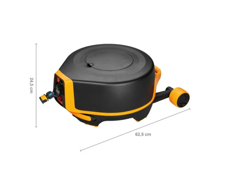 Der Gartenschlauch-Aufroller verfügt über ein innovatives, horizontales Design und kann so freistehend und unabhängig einer Wandhalterung aufgestellt werden. Dank 360°-Drehung folgt die Schlauchtrommel in jede Richtung und du kannst dich bei der Gartenbewässerung ohne lästige Knicke im Schlauch frei bewegen. Die Bewässerungsfläche wird so bis zu 1.256 m² erweitert und entspricht fast der doppelten Fläche im Vergleich zu wandmontierten Schlauchtrommeln. Zusätzlich verhindert die horizontale Bauweise das Umkippen.