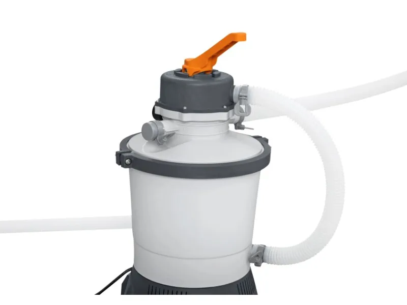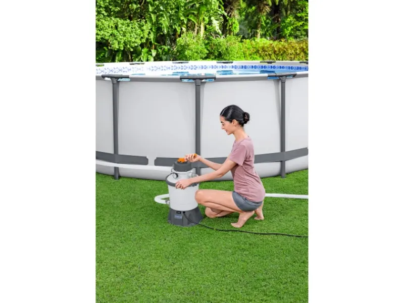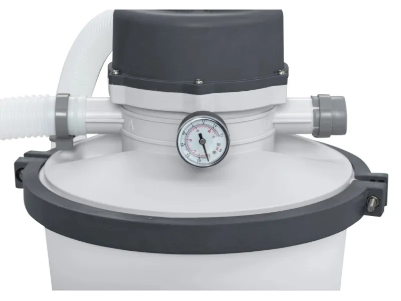 Der beiliegende ChemConnect Chemikaliensodierer versorgt das Wasser gleichmäßig mit Chlor. Die Filterpumpe ist schnell und einfach montiert. Für eine einfache Handhabung hat die Poolpumpe ein 6-Wege-Ventil zur einfachen Filtersteuerung sowie ein gut ablesbares Manometer. Das Regelventil ist zur einfachen Einhand-Hebelbedienung um 360° drehbar. Die Sandfilteranlage ist mit allen Pools mit 32 mm Stülpschläuchen kompatibel.