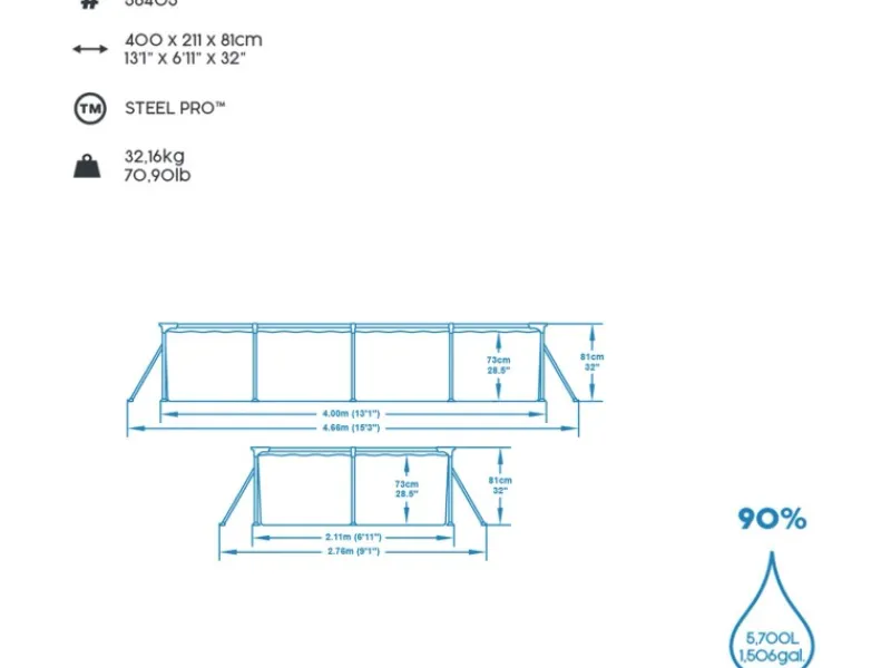 Mit dem Bestway Frame Pool Steel Pro holen Sie sich ausgelassenen Badespaß direkt nach Hause. Ganz ohne Schnickschnack kann der korrosionsbeständige Stahlrahmen mit Antihaftbeschichtung dieses Swimmingpools (400 x 211 x 81 cm) durch stabile T-Verbinder im Handumdrehen aufgebaut werden. Danach heißt es: Wasser marsch. Ganze 5.700 Liter passen in diese himmelblaue, eckige Wellnessoase – Ein Highlight für die ganze Familie. Die 3-lagige Poolfolie aus hochwertigem DuraPlus-Material ist nicht nur robust, sondern macht den Steel Pro besonders langlebig. Damit das Wasser lange kristallklar bleibt, kann durch die integrierte Anschlussmöglichkeit ein Filtersystem angeschlossen werden. Der selbstklebende Reparaturflicken hilft zusätzlich, kleine Schäden am Pool auszubessern. Nach der Badesaison kann das Wasser ganz leicht aus dem Inneren abgelassen werden: Das eingebaute Ablassventil mit Gartenschlauchadapter steht Ihnen zur Seite. Im Nu ist der Steel Pro Aufstellpool leer und kann eingelagert werden. Machen Sie diesen Sommer zur schönsten Zeit des Jahres.