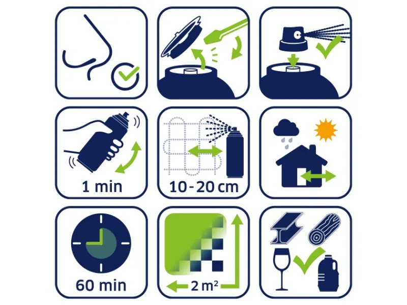 Untergründe müssen sauber, trocken und fettfrei sein. Sprühkopf abnehmen, Sprühsicherung entfernen, dann Sprühkopf wieder aufsetzen. Dose 1 Minute gründlich schütteln, sodass sich die Pigmente vermischen. Probesprühen und Farbton prüfen. Dose senkrecht halten. Außerhalb des Lackierobjektes beginnen, um Überbeschichtungen zu vermeiden. In gleichmäßigen dünnen Schichten, mit einem Sprühabstand von 10-20 cm, lackieren. Die ideale Arbeitstemperatur liegt bei +20 °C. Einen dünnen Spritzgang vorlackieren, nach 5-10 Min., gleichmäßig deckend endlackieren. Die Oberfläche glättet sich beim Trocknen zu einer gleichmäßigen, glatten Lackoberfläche. Nach jedem Spritzgang und nach dem Arbeitsende den Sprühkopf abwischen.