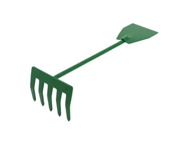Das Friedhofsgerät ist aus pulverbeschichtetem Stahl hergestellt. Mit seinen 5 Zinken auf der einen und dem Blatt auf der anderen Seite die das Kleingerät die ideale Kombination aus Rechen und Spaten. So lassen sich der Garten, aber auch Gräber, einfach und schnell pflegen.