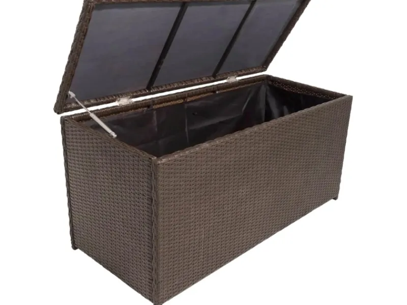 Die Auflagenbox Patras besticht durch ihre Stabilität und ist mit einem robusten schwarzen Stahlgestell ausgestattet. Das 7 mm flache Kunststoffgeflecht in Grau verleiht ihr ein modernes und ansprechendes Design. Der Deckel dieser Box wird sanft und sicher durch eine Gasdruckfeder gebremst, was ein komfortables Öffnen und Schließen ermöglicht. Im Inneren befindet sich eine schwarze Folieninnentasche, die Ihre Gegenstände zusätzlich schützt.