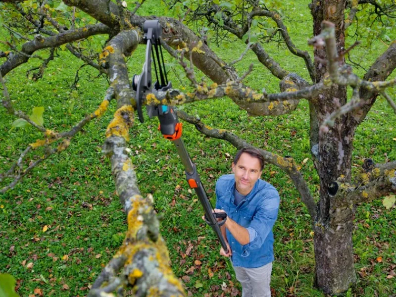Die Gardena Combisystem-Bypass-Baumschere ist optimal für das Schneiden von frischen Ästen in großen Höhen. Mit einem Gardena Combisystem Teleskopstiel schneiden Sie die Äste sicher vom Boden aus ohne Leiter. Dank der integrierten doppelten Hebelübersetzung und der 5-fachen Rollenübersetzung ist die Bedienung enorm kraftsparend und gewährleistet damit ein müheloses Schneiden von Ästen mit einem Durchmesser bis zu 35 mm. Die Antihaftbeschichtung der Messer und ihre spezielle Geometrie fixieren den Ast beim Schneiden, sorgen für einen exakten und sauberen Schnitt und lassen sich anschließend einfach Reinigen. Die integrierte Asteinhängung erleichtert Ihnen die Arbeit zusätzlich. Der einstellbare D-Griff macht die Bedienung der Baumschere besonders komfortabel. Zusätzlich verfügt der Griff über eine Seilaufwicklung inklusive Fixierung, damit sich das Seil bei der Bedienung und Lagerung der Schere nicht verknotet. Das Zugseil ist 4,7 m lang und reißfest.