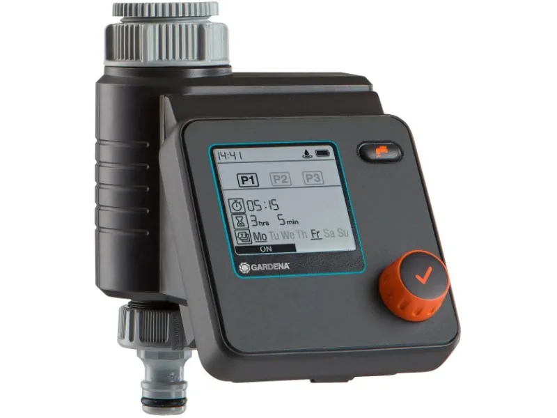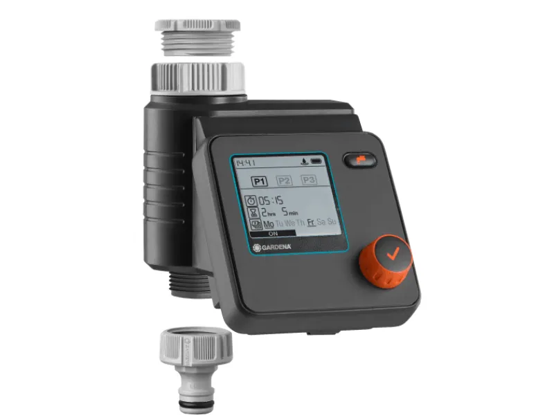Die Bewässerungssteuerung ist batteriebetrieben, wird direkt an den Wasserhahn angeschlossen und lässt sich mithilfe des Dreh- und Drückschalters bedienen. Ein gut lesbares LC Display zeigt alle Einstellungen auf einen Blick an. Die Safe Stop-Technologie verhindert den Start der Bewässerung, wenn der Energiestand der Batterie zu gering ist. So läuft der Wasserfluss niemals unkontrolliert. Die Batterieanzeige im Display weist rechtzeitig darauf hin, wenn die Batterie ausgetauscht werden muss.