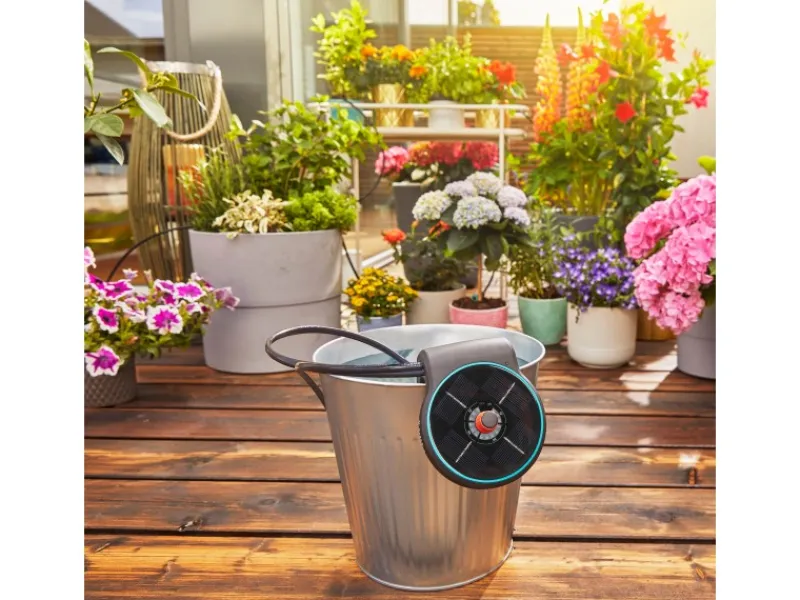 Das Bewässerungssystem kombiniert eine Pumpe zum Entnehmen von Wasser, eine Steuereinheit zum Bestimmen des Bewässerungsplans und ein Solarmodul, das die mitgelieferten wiederaufladbaren Batterien versorgt. Dieses 3-in-1 System übernimmt automatisch die Pflanz-Bewässerung.