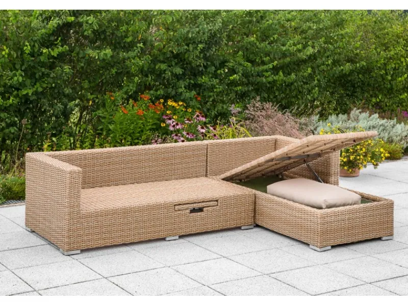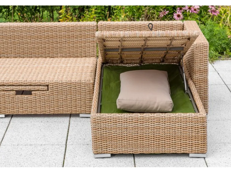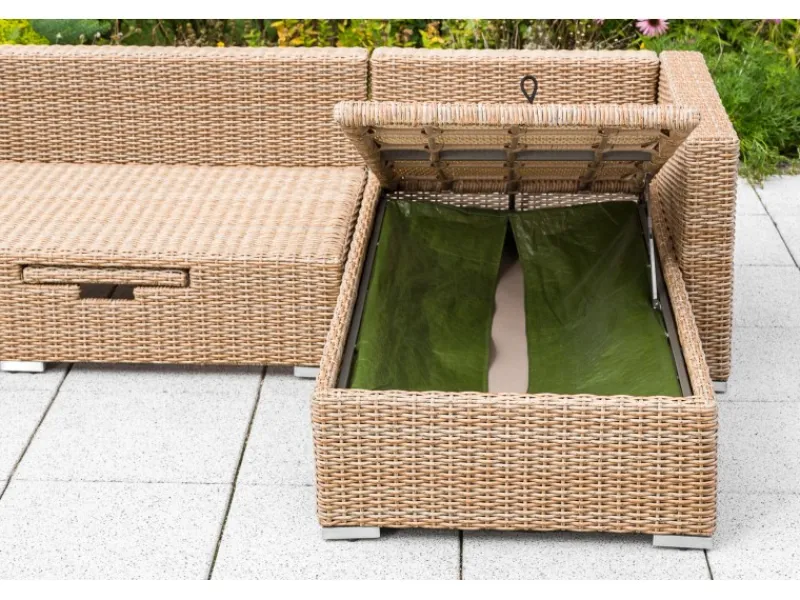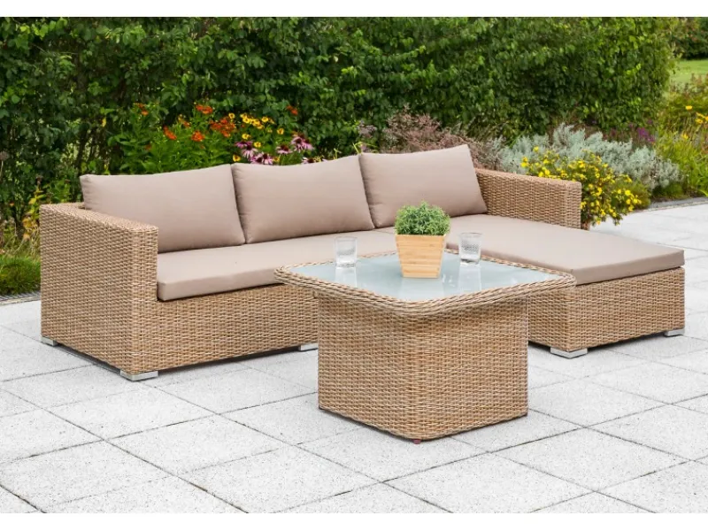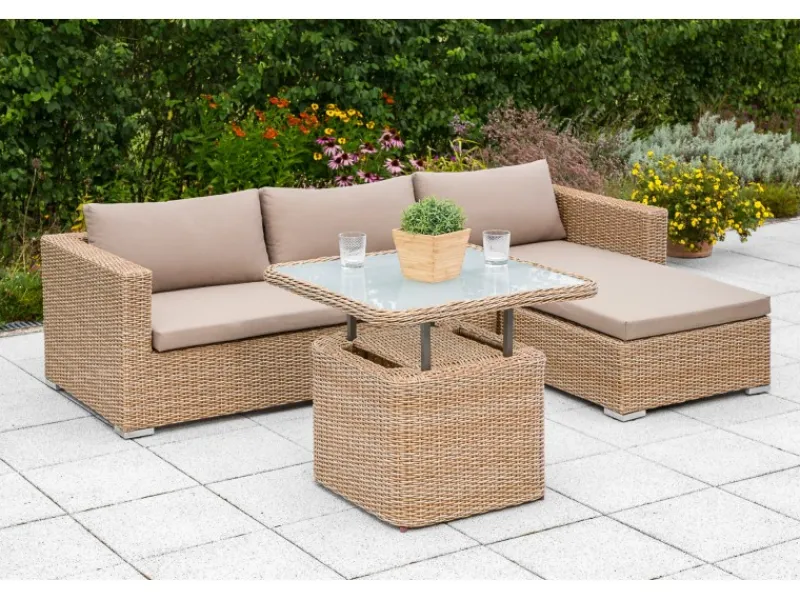 Die Garten Eckbank-Gruppe ist aus einem pulverbeschichteten Stahlgestell mit Polyrattan gefertigt. Die Tischplatte besteht aus Sicherheitsglas.