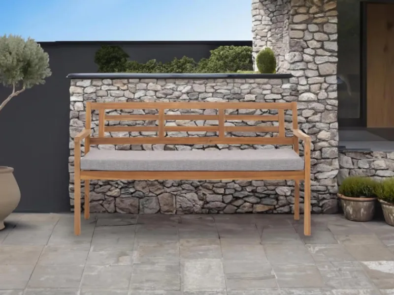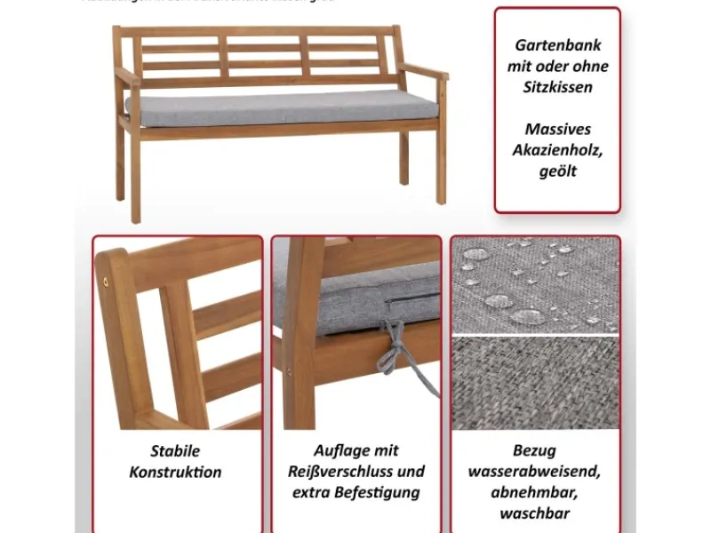 Die Gartenbank aus massivem Akazienholz bietet nicht nur ein ansprechendes Design, sondern überzeugt auch durch ihre herausragende Qualität und Langlebigkeit. Hergestellt aus geöltem, massivem Akazienholz, verleiht sie Ihrem Garten oder Ihrer Terrasse einen natürlichen und zugleich eleganten Charme. Die Bank zeichnet sich durch ihre stabile Bauweise aus, die für jahrelange Freude sorgt und selbst den unterschiedlichsten Witterungsbedingungen standhält. Ein besonderes Highlight ist die Ausführung mit optionalem wasserabweisendem Bezug. Der Bezug ist abnehmbar und waschbar, was die Pflege der Bank erheblich erleichtert und dafür sorgt, dass sie immer in einem einwandfreien Zustand bleibt. Zusätzlich ist die Auflage mit einem Reißverschluss ausgestattet und verfügt über eine extra Befestigung, die ein Verrutschen verhindert und optimalen Sitzkomfort gewährleistet. Durch diese durchdachten Details wird Ihre Zeit im Freien noch angenehmer.