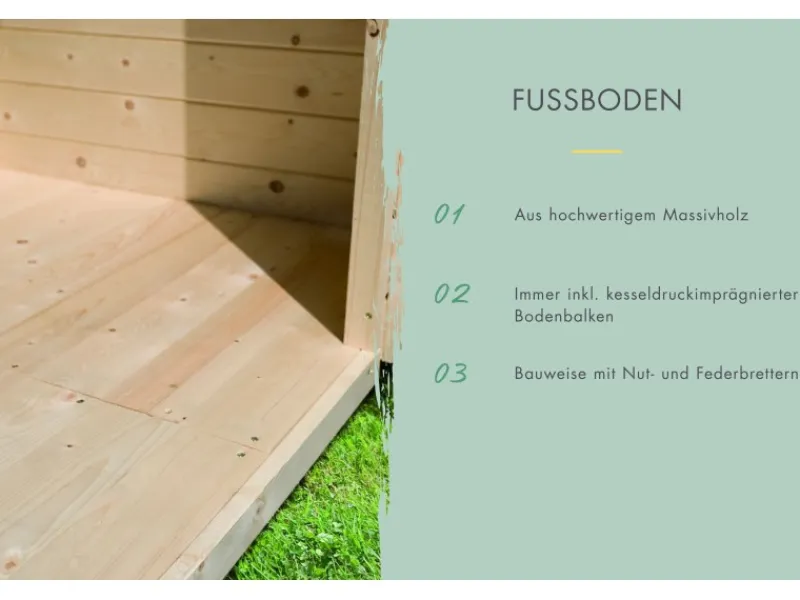 Das Gartenhaus ohne Anbauten hat ein Sockelmaß von 393 cm x 393 cm. Bodenbalken sorgen für den Schutz von unten und werden unter das Gartenhaus gelegt. Durch die Kesseldruckimprägnierung der Bodenbalken sind diese vor Witterungseinflüssen und holzzersetzenden Pilzen bereits geschützt.