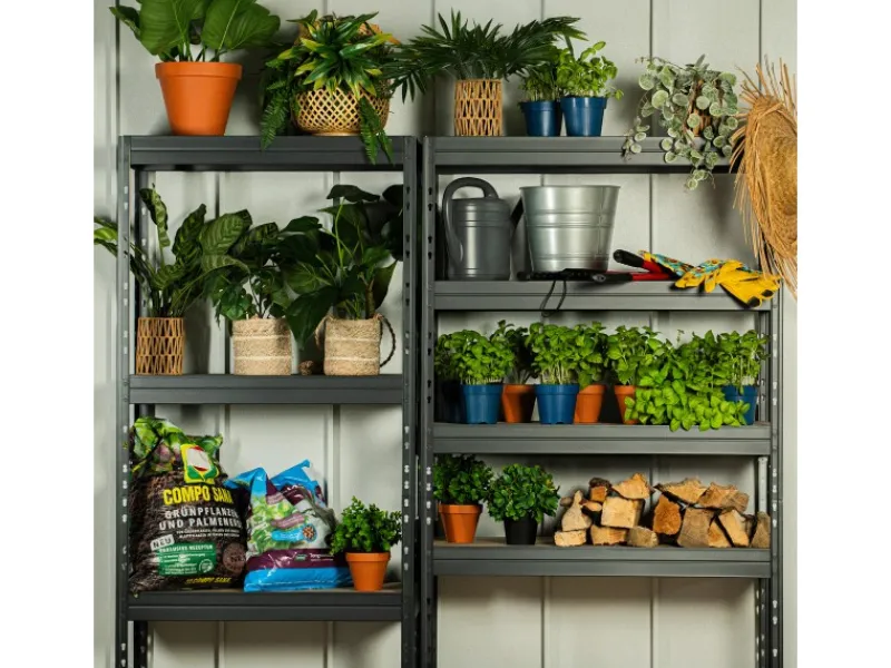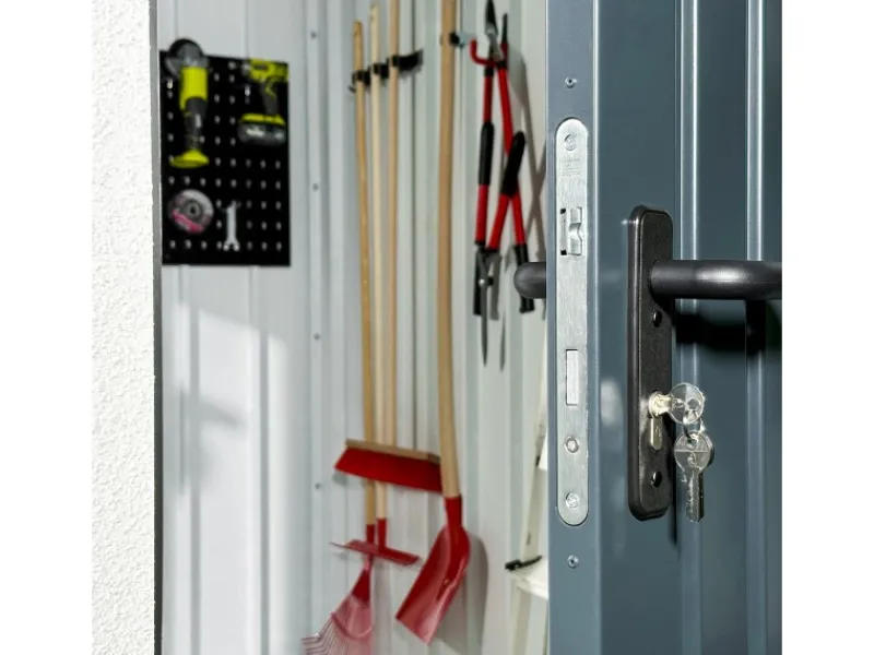 Die smarte Innenwand des Gerätehauses ermöglicht es, Haken, Wandhalterungen und sonstige Befestigungen von beliebigen Herstellern mit selbstschneidenden Schrauben an jeder Position zu befestigen. Hierbei kann die Wand mit sehr hohen Gewichten belastet werden, ohne dass sie sich verbiegt oder nachgibt. Werkzeug, Fitnessgeräte, Fahrräder oder sogar schwere Autoreifen können unproblematisch an den Innenwänden aufgehängt werden.