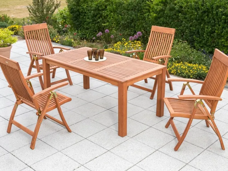Die Gartenmöbelgruppe besteht aus einem zertifizierten FSC-Eukalyptusholz, welches mit einem naturbelassenen Öl behandelt wurde. Die Stahlschrauben sind für eine bessere Haltbarkeit galvanisiert.