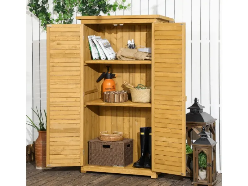 Dieser Geräteschuppen von Outsunny kommt in einem nostalgischen Design und mit jeder Menge Stauraum. 3 Regale bieten viel Stauraum für Gartengeräte, Werkzeug, Spielzeug und Sitzpolster. Zwei Lamellentüren sorgen für eine gute Belüftung, sodass der Inhalt vor Staunässe und Feuchtigkeit geschützt ist. Der stabile Geräteschuppen besteht aus versiegeltem Tannenholz und einem Dach mit Bitumen-Pappe, sodass Sie diesen bei Wind und Wetter draußen verwenden können. Dieser Geräteschuppen ist die ideale Aufbewahrungslösung für alle Außenbereiche.