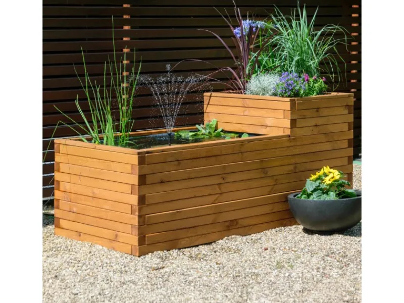 Der Gartenteich besteht aus FSC®-zertifiziertem Kiefernholz und ist wetterfest lasiert