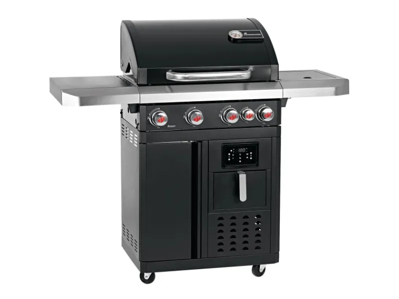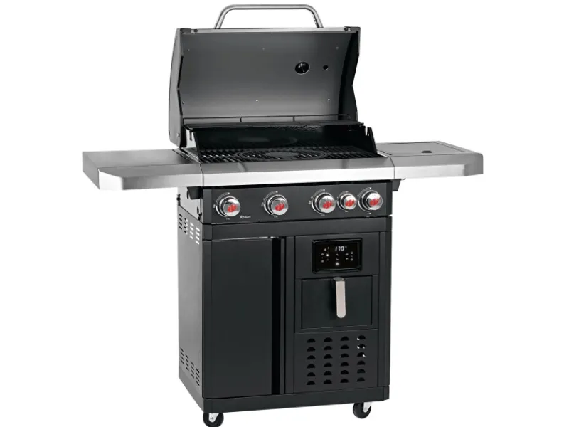 Doch, wirklich: Der Gasgrill hat eine eingebaute 3,5 Liter-Heißluftfritteuse mit LED-Display, so dass Sie Ihren Grill-Speiseplan um knusprige Nuggets, Pommes oder Kartoffelecken erweitern können – und zwar nahezu ohne Öl. Und das ist noch nicht alles: Mit dem praktischen Modulus Grillrost-System schaffen Sie sich Ihre Grillfläche ganz genau so, wie Sie sie brauchen – z. B. mit Wok, Pizzastein oder Grillplatte. Ihr bereits fertig gegartes Grillgut bleibt auf dem emaillierten Warmhalterost lange frisch und kann aufgrund der Vielfalt an Leckereien daher auch mal länger auf den nächsten Abnehmer warten.