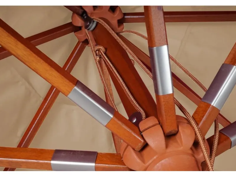 Der Schirm muss sich leicht entfalten lassen. KEINE Gewalt oder Kraft anwenden. Auch wenn die Streben des Schirmes extrem verstärkt sind, besteht – wie bei allen Schirmen – die Gefahr, dass die Holzstreben sich verkeilt haben. In diesem Fall bitte vor dem Öffnen unter den Stoff greifen und die Holzstreben wieder korrekt anordnen. Im Anschluss lässt sich der Schirm leicht entfalten.